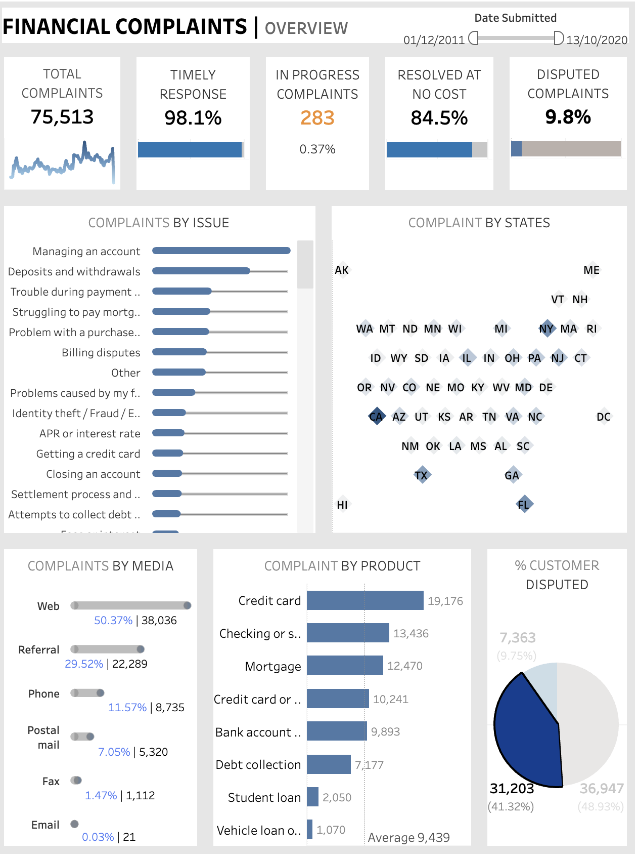 This project constructs an insightful visual representation of consumer complaints, offering an in-depth analysis of their current status, submission channels, geographical distribution, complaints by issues, and product categories that the complaint is related to. This tool assists management in understanding and addressing consumer concerns effectively.
